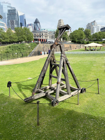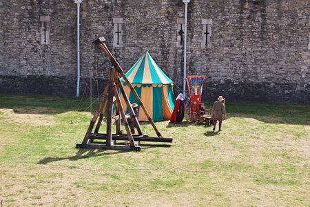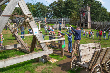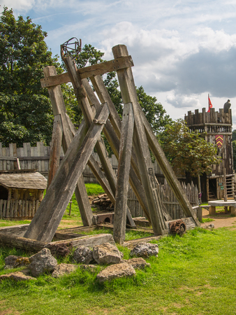 Essex, UK - 31 August, 2018: Catapult. Norman village reconstruction, educational centre for kids with historical activities as knight fighting, catapult operation and every day life experience.