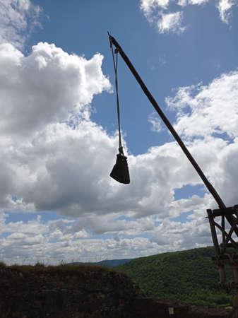 Castelnaud-la-chapelle, Dordogne, France - Jully 3 2020: Medieval trebuchet catapult Castelnaud Castle in Dordogne valley, Perigord Noir, France