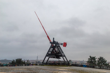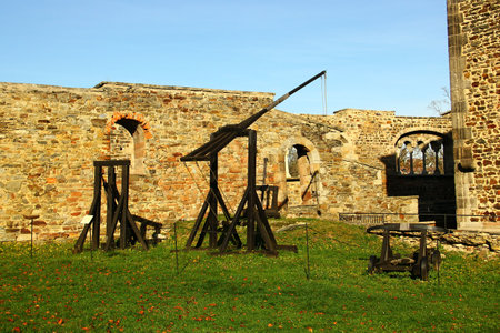 Cheb, Czech Republic - November 3,2024: Old wooden catapult in Cheb Castle, an imperial palace, castle complex and fortress above the river Eger in the town of Cheb in the western Czech Republic.