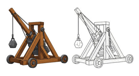 Medieval Trebuchet Coloring Page with Detailed Colored and Outline Designs Siege Warfare