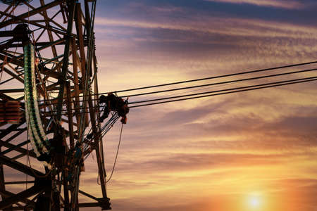 Worker wiring electric power on steel tower, Electric construction and maintenance services throughout, Electric Power Transmission Infrastructure and Highest voltage transmission concept