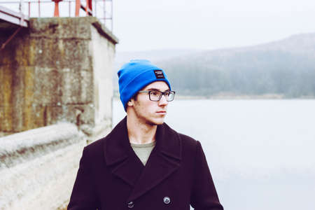 Stylish handsome guy teenager boy 18-19 year old wear knit hat and trendy winter jacket posing over river bank at city view outdoor. Teen young student man with sun glasses with backpack.