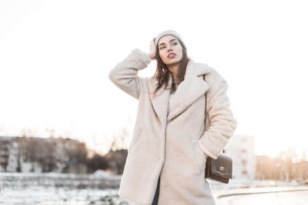 Cute attractive stylish young woman in a fashion winter faux fur coat in a knitted trendy hat with bag enjoys the bright sunlight on the street. Pretty beautiful girl outdoors on a warm winter day.
