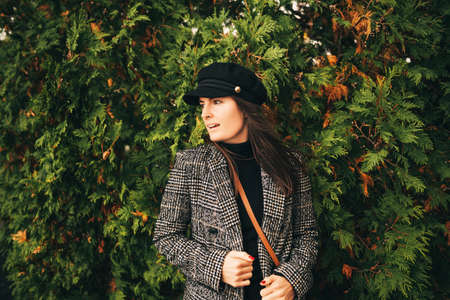 Outdoor portrait of beautiful young woman with dark hair, wearing check blazer and black cap