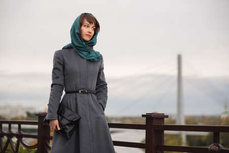 Young fashion woman with handbag walking on city street Stylish female model in gray classic coat and head scarf