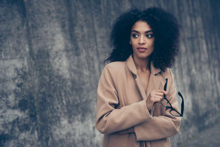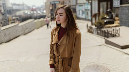 Beautiful lady in spring clothes, wearing a brown coat, standing on the background of a beige wall, looking into the camera. Stylish girl against the background of the wall. Copyspace