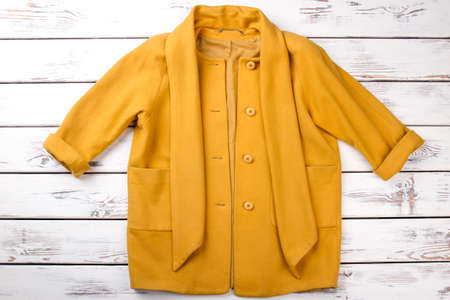 Female elegant yellow cashmere topcoat. Women fashion autumn apparel on white wooden background. Feminine fashion and style.