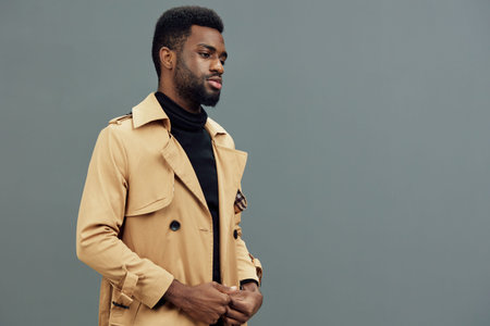 Stylish young African man in a beige trench coat against a minimalist gray background, exuding confidence and modern fashion