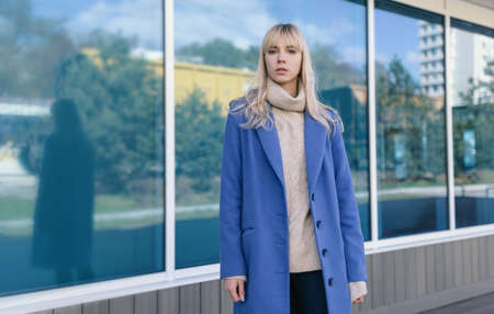 Beautiful girl in a coat in business downtown
