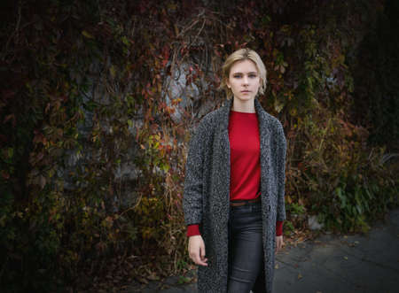 Portrait of young blonde in gray coat on blurred background of green trees
