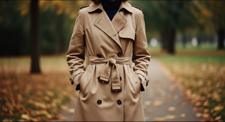 Close-up of a woman in beige trench coat walking in autumn park