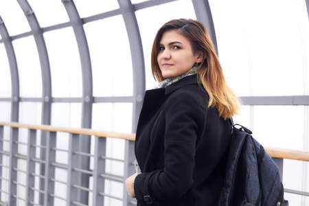 young beautiful woman with city backpack looks around walking along the covered overpass