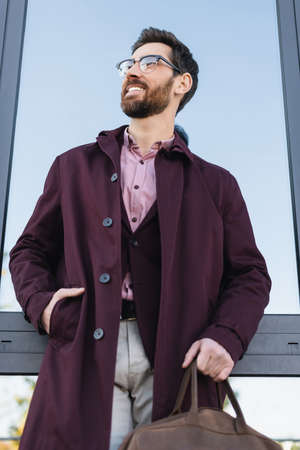 Low angle view of smiling businessman in trench coat holding bag near building outdoors