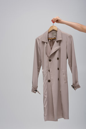 cropped view of woman holding recyclable trench coat on hanger isolated on grey