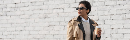 african american businesswoman in sunglasses and stylish trench coat holding coffee to go and looking away near brick wall on street, banner