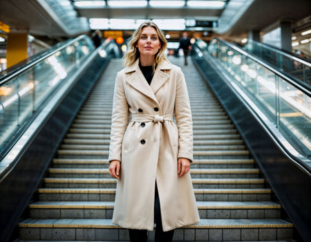 photo of beautiful woman with winter coat standing in front of escalator, generative AI