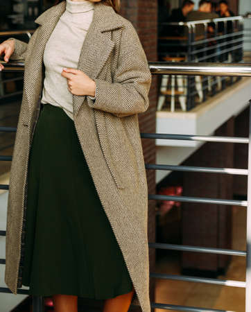a girl in a beige coat and sweater, a green, long skirt, stands near the railing, leaning on the railing. rest, fashion show, challenge. rests on railing