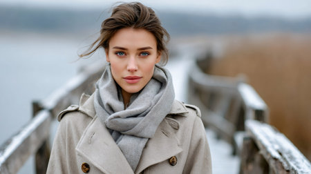 Young woman standing on a snowy wooden bridge during winter
