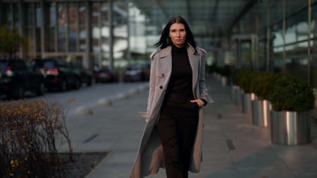 elegant and serious businesswoman is walking in business center of city in autumn