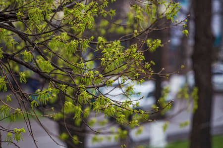 Appearance of leaves and earrings on the branches of a tree in the city. Spring time. Appearance of leaves on a maple. Close-up