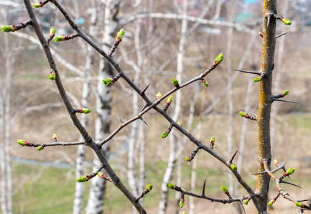 Young Spring Pawthorn Buds. Prickly Shrub Branches in the April Siberian Forest