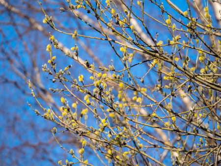 Close up of growing and blooming willow in the spring.