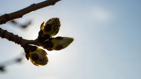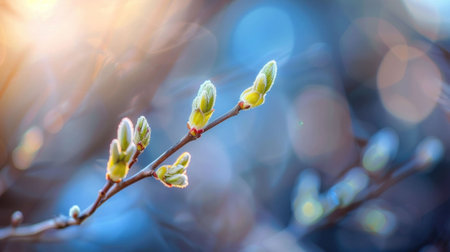 Spring buds on a branch, delicate green shoots emerging, set against a soft bokeh background of blues and warm sunlight, symbolizing renewal and growth in nature