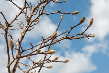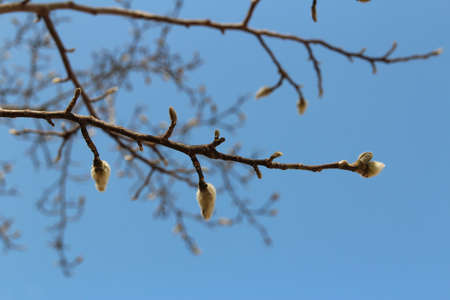 Magnolia buds with the artistic branch and clear blue sky in autumn, South Korea
