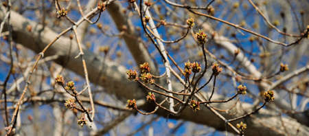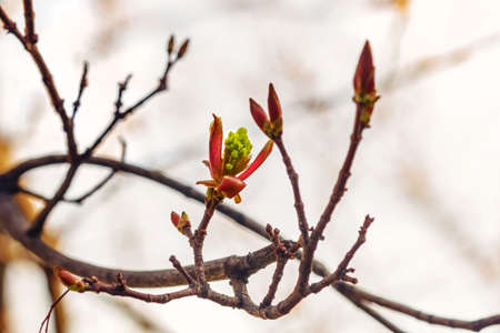 First, early spring, flowering, budding of trees, branches, leaves, background, free space, maple tree seeds Beautiful flowering awakening development sunny day