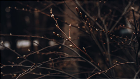 Emerging buds on twigs against a dark background in early spring.