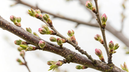 Close-up of a budding branch against a light background, minimalist nature concept