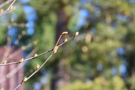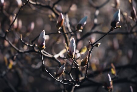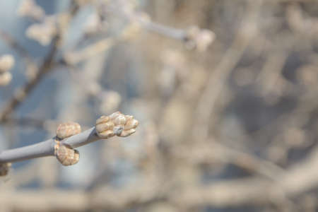 Spring background. Buds of tree are ready to bloom, warming. Blurred background, selective focus, copy space.