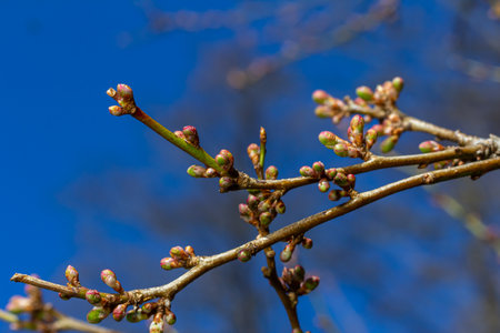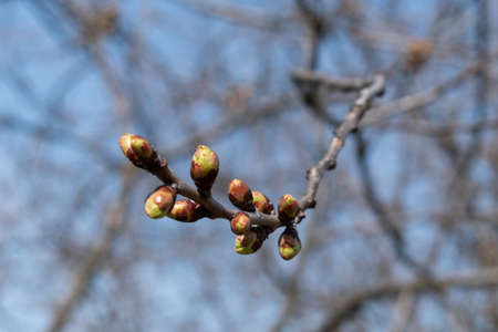 Cherry green swollen buds in spring, cherry blossom twig in bloom