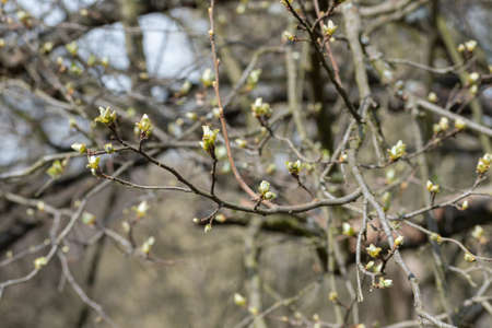 View of newly sprouted green buds on a tree branch, Freshly sprouted buds on trees
