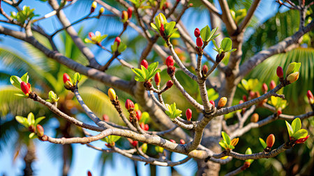 Tree branches adorned with fresh green buds and delicate blossoms, signaling the start of a new season. Generative AI