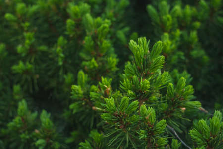 green pine branches - Close-up of a pine branch with a new young shoot. The green needles on the branch form a semicircle at the end of the branch, dwarf mountain pine, mugo.