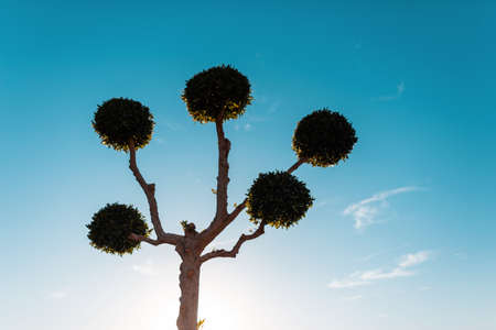 Beautiful exotic tree with branches and green leaves against the blue sky at sunset. Summer rest. vintage nature color