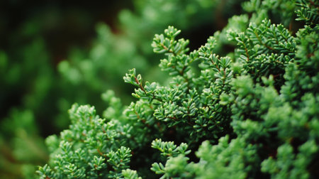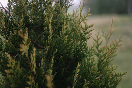 Close-up of bright green texture of natural greenery of the needles of Thuja tree. Selective focus. Interesting nature concept for design.