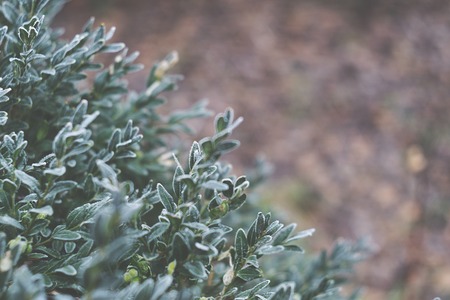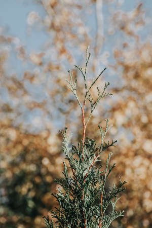 Green background with a coniferous motif. Early spring in the garden. Park charms.