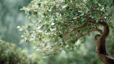 A detailed photograph of a single Acacia, swaying gently in the wind, captured in natural daylight. Fresh and airy atmosphere, soft motion blur on leaves, crisp details on textures, background softly blurred into natural greenery, cinematic natural light, realistic photography style.
