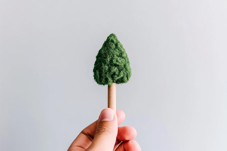 A clever and simple concept ideal for campaigns on environmentalism, climate change talks, or green living lifestyle blogs | This image shows a human hand holding a popsicle stick, but instead of an icy treat on top, there is a small, perfectly shaped tree. The tree, crafted from what appears to be moss or a similar textural green material, symbolizes nature and is a playful twist on summer snacks. The stark contrast between the artificial texture of the tree and the organic form it represents ignites a dialogue on the impact of human consumption on nature. Against the backdrop of a clear, neutral tone, the greenery commands attention, encapsulating nature's fragility amidst man-made environments. The photograph blurs the line between reality and art, prompting viewers to rethink their relationship with the environment and consider sustainable practices. The clean composition and ample negative space afford designers and editors the flexibility to overlay text or additional graphics | This image is well-suited for educational contexts to spark conversation about environmental responsibility, can serve as an engaging visual for articles on innovative sustainability ideas, or could be used in advertising materials for eco-friendly products. It can also be an illustrative element in discussions about deforestation and reforestation projects, adding a touch of creativity and hope. The concept lends itself to desktop wallpapers or posters for Earth Day events, advocating for a cleaner, greener planet | A concept photo of a hand holding a tree-shaped object on a popsicle stick against a solid background, stirring thoughts on environmentalism and conservation with its vibrant green hue and sustainable message, while offering visual simplicity and space for customization