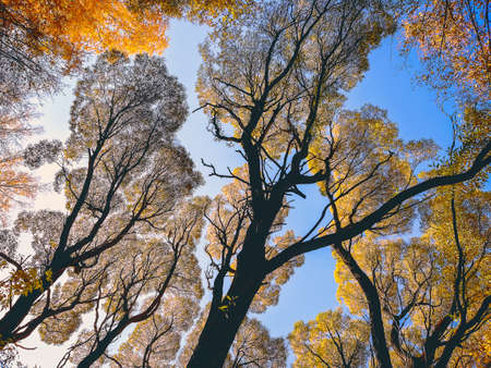 Looking Up at Tall Trees in the Park on an Autumn Day. Warm Light, Yellow Foliage, Capillary Like Silhouettes of Treetop Branches, Blue Sky. Change of Seasons, Autumn of Life Concept.