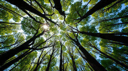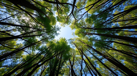 An upward angle captures tall trees with lush green foliage, bathed in sunlight. The composition emphasizes the height of the trees, creating a sense of depth and openness. The image's natural beauty suits various commercial and editorial applications, offering a tranquil visual.