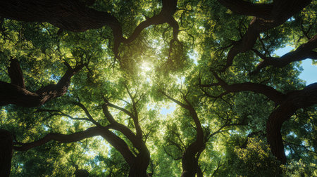 An upward perspective captures the dense canopy of tall trees reaching towards the sky. The image showcases vibrant green foliage with a mix of light and shadow, highlighting natural textures. This overhead shot creates a sense of depth and evokes feelings of tranquility suitable for various commercial purposes.