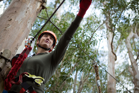 Hiker woman holding zip line in forest during daytime