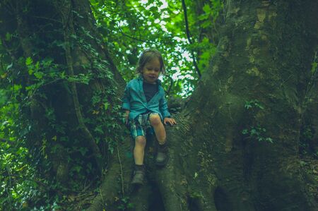 Little kid on a tree branch. Baby boy climbs a tree.