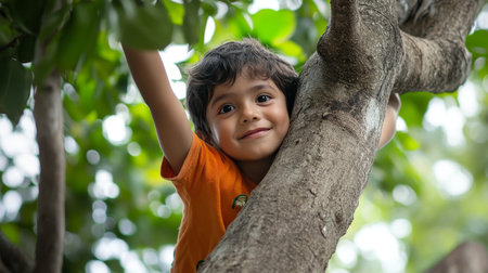 Child Climbing Tree with Enthusiastic Expression