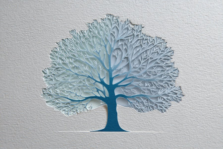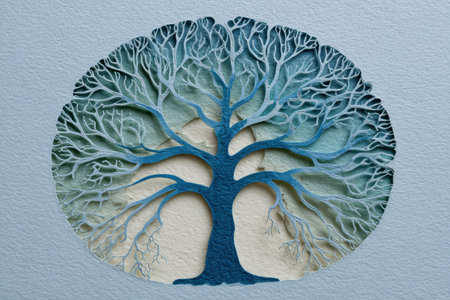 A stunning paper cut artwork featuring a tree design with intricate branches and roots, showcasing artistic details in blue tones against a textured background.