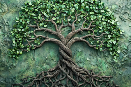 A stylized illustration depicts a tree with lush foliage growing above while its intricate roots stretch beneath. This artwork emphasizes nature's balance and growth.