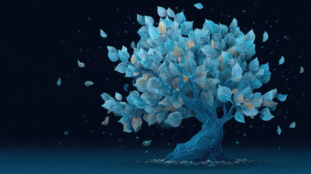 This stunning digital artwork features a beautifully stylized tree with vivid blue leaves and falling petals against a dark backdrop, evoking a sense of tranquility.